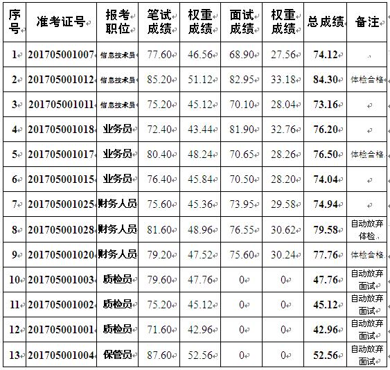 惠州市儲備軍糧供應公司公開招聘員工筆試、面試、體檢工作已結束。現將進入面試環節的考生總成績(總成績=筆試成績×60%+面試成績×40%)、體檢結果予以公示。